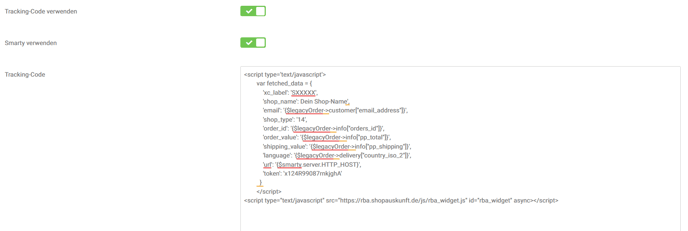 Hinterlege unter “Tracking-Code (Body Bestellabschluss)” den folgenden Codeschnipsel und aktiviere die Schalter “Smarty verwenden” sowie „Tracking-Code verwenden“: